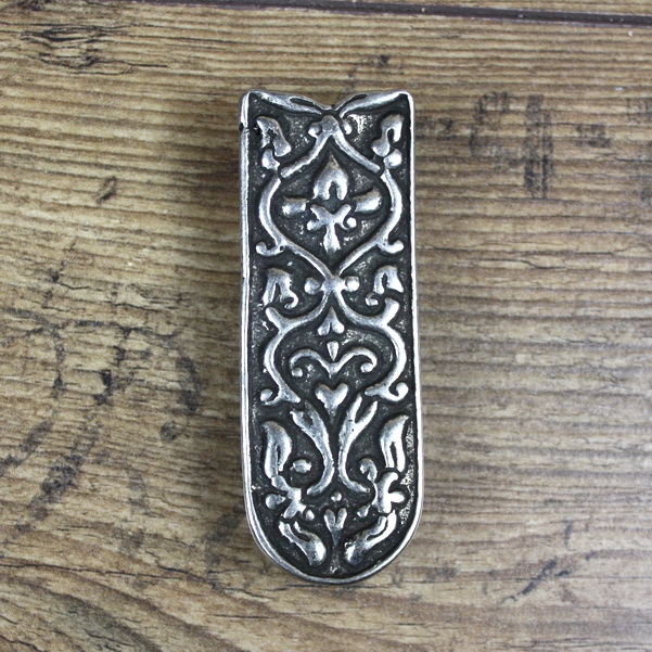 Auf der Rückseite befinden sich Stifte, auf die man zur Befestigung einfach die mitgelieferten kleinen Kappen aufsetzt und dann das Metall mit einigen leichten Hammerschlägen am Leder fixiert.