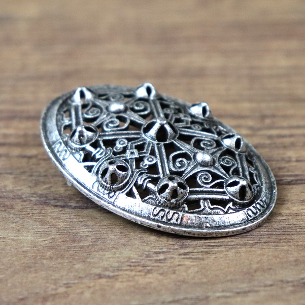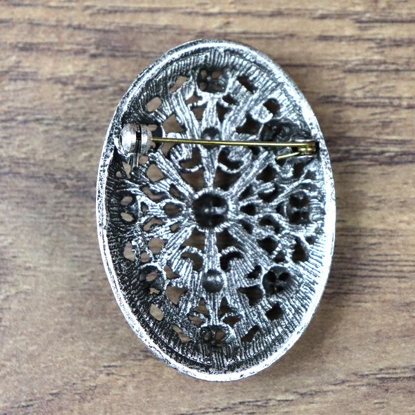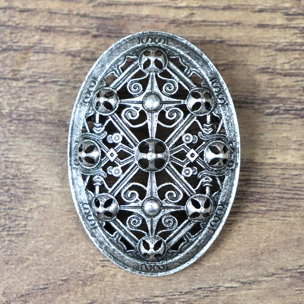 Modeschmuck Material: Zamak Farbe: Altsilber Größe: 56 x 39 x 9 mm Auf der Rückseite ist eine Sicherheitsnadel