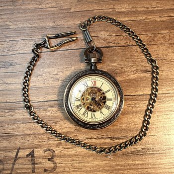 Pocket watch to wind up (without battery), a partially transparent cover at the front that can be opened. A window at the back to view the clockwork, size: diameter 5 cm (with button at the top 7 cm), chain 37 cm with pocket clip hook
